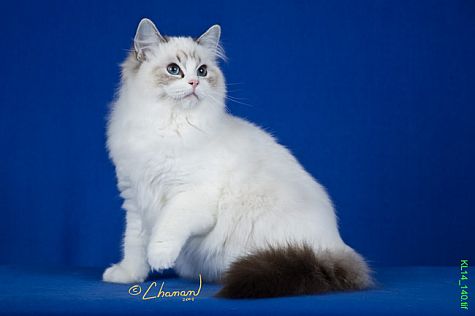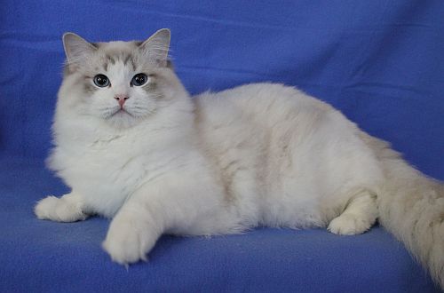 Kelsey’s eyes are the deepest blue, her fur is the softest, and her personality is relaxed and loving. We showed her during last years show season, with phenomenal success. Kelsey was the first cat that really thrived on showing, and we had a wonderful time showing her during the show season.