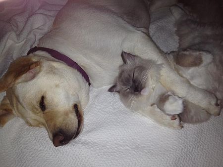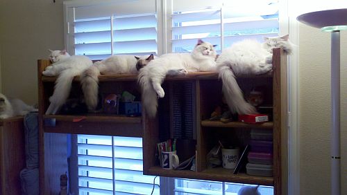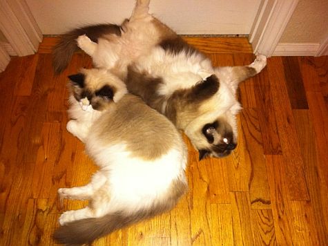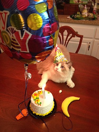 The love that this dog and cat have for one another is a special gift for us to watch. That spooning occurs every single night. Mickey and I have decided to just move to one of the kids rooms and give them our bed! Of course you can put pics of the angels on your website. I’m disappointed for you that they do not depict how truly gorgeous and outrageously magnificent Einstein is. I took these right after his haircut. He is the quintessential ragdoll in every way. Big big boy with such beauty and grace. His disposition, to die for, sweet and gentle giant! And Albert is still cute cute cute and busy busy busy. If he were a human he would be in the Vaudeville Circus with a top hat and cain singing I’m Here To Entertain You! Of course, they are still the highlight of our lives. If i’ve said it once, i’ve said it 100 times, “We had no idea the sheer joy these two boys would add to our lives”.